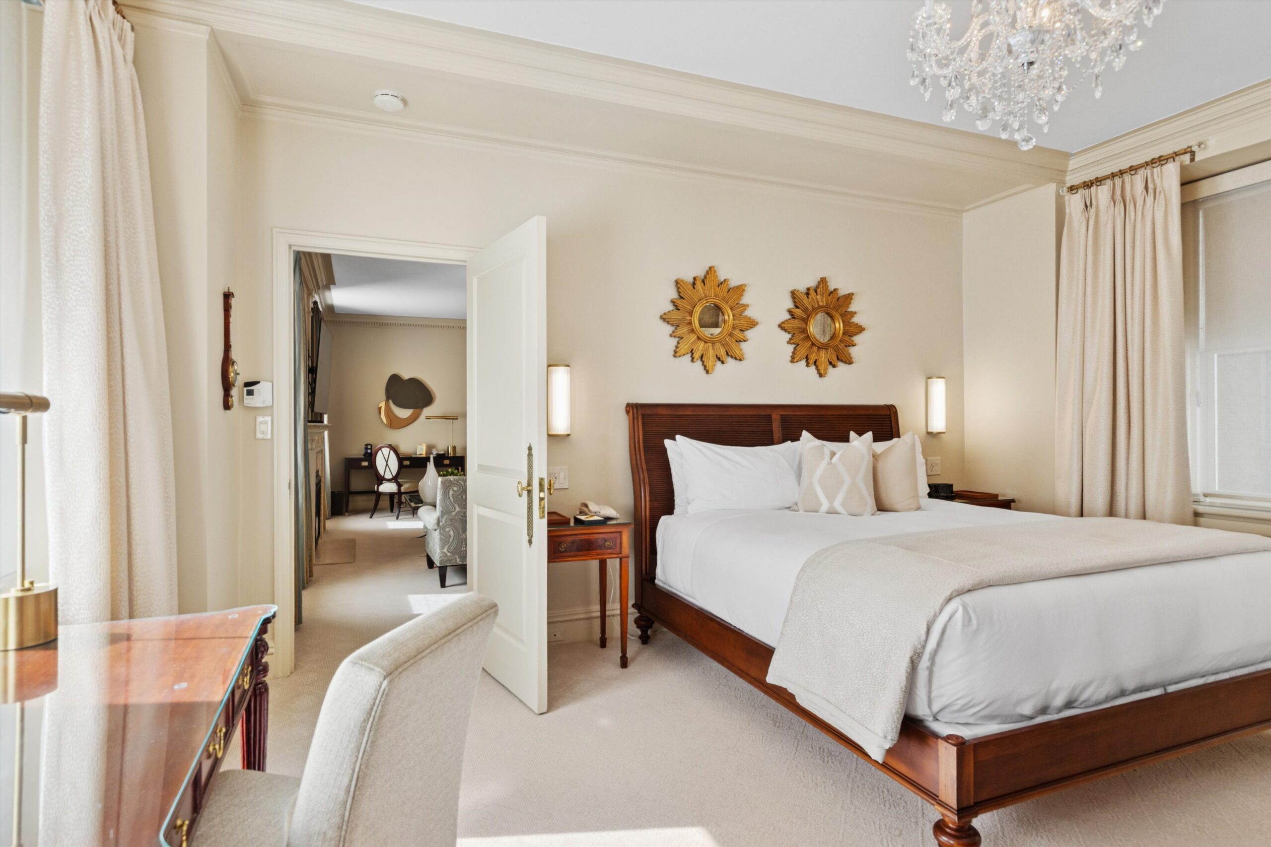 Sophisticated serenity—this inviting suite pairs timeless design details like crown molding and crystal lighting with warm wood tones and plush bedding, creating a seamless transition from rest to relaxation.