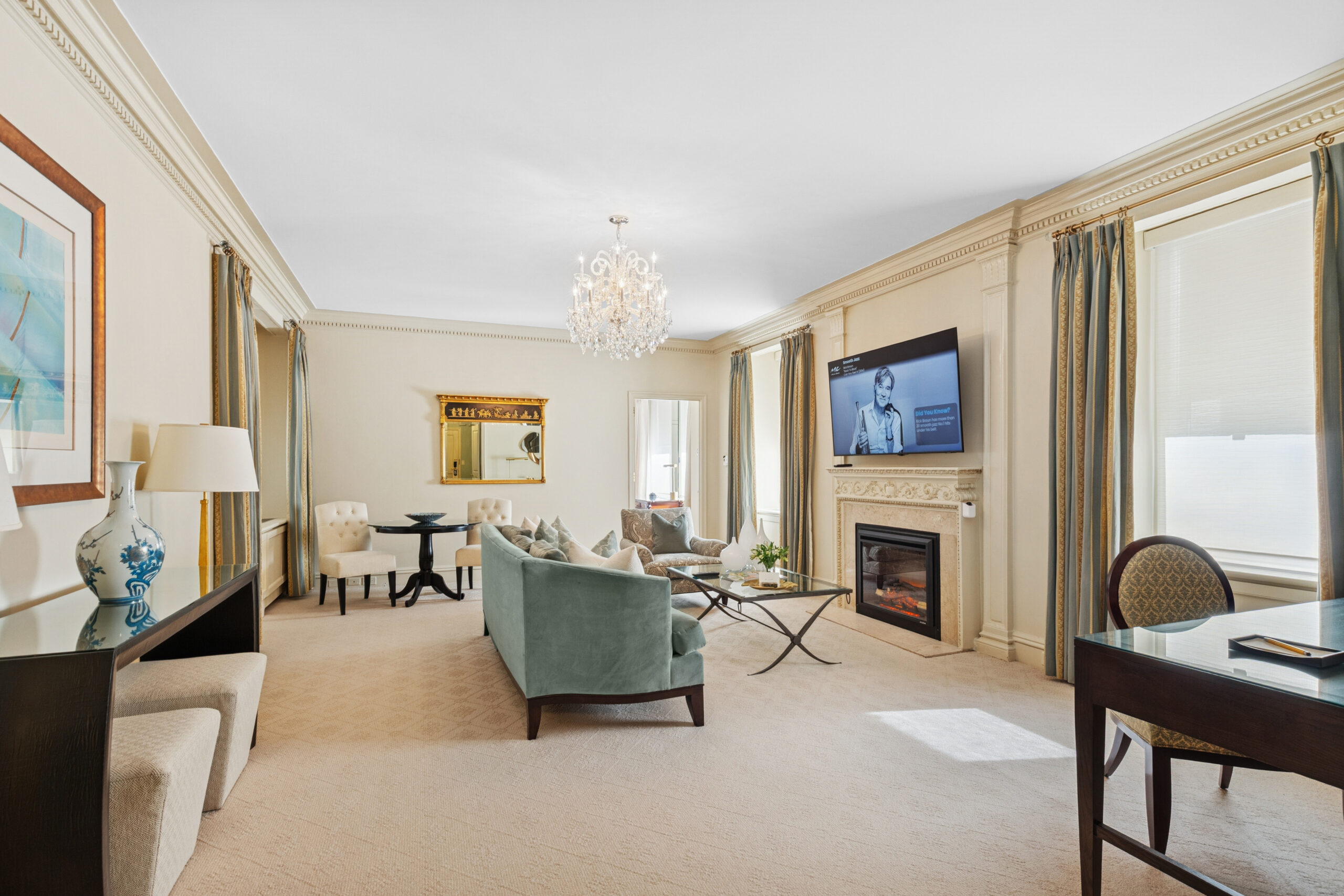 This refined suite invites relaxation and conversation with its stately fireplace, plush seating and a sophisticated dining nook framed by traditional décor and warm lighting.